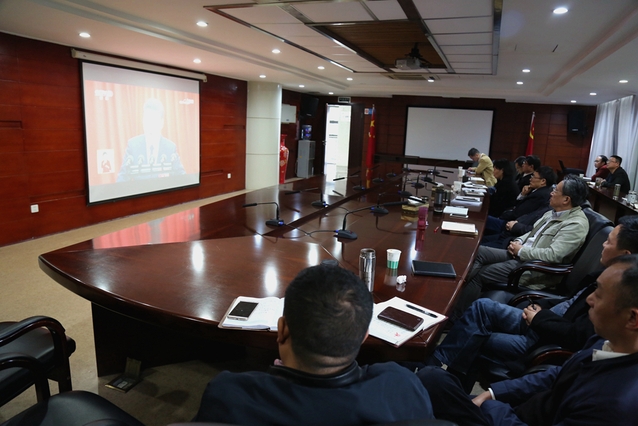机关业务单位党员职工在行政楼底楼报告厅集中收看