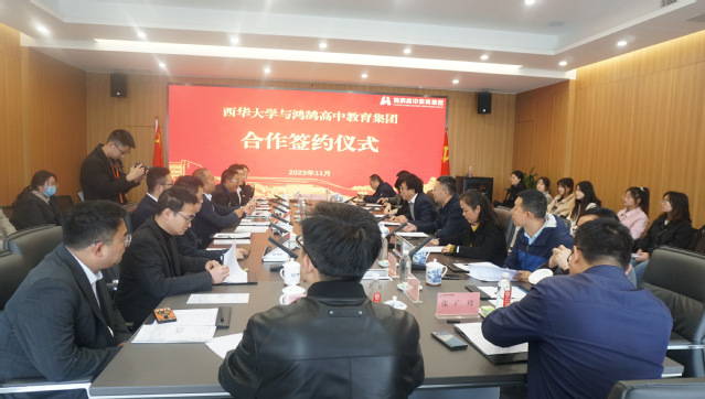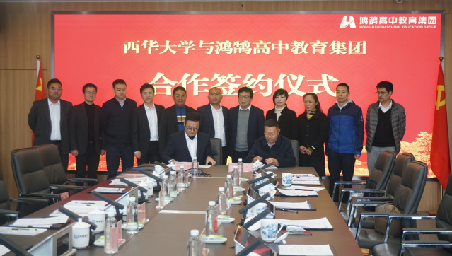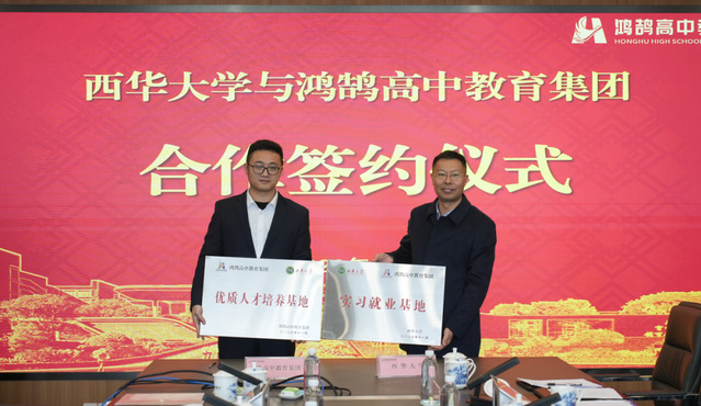 鸿鹄教育集团教研院院长黄培洋、人力资源总监尹超分别介绍了学校的教育教学、师资培养、办学特色及“鸿鹄班”校企合作模式。座谈会最后,招生与就业处处长杨洪代表学校与鸿鹄高中教育集团签订人才供需校企合作协议,并互授基地牌匾。