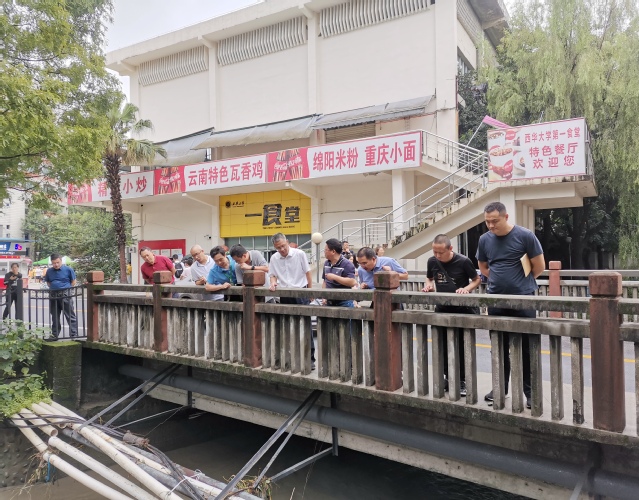 据悉,8月11日暴雨来袭后,沱江河水位迅猛上涨,校内多个区域积水严重,学校后勤服务总公司迅速启动应急预案,并成立了党员突击队,第一时间奔赴现场投入防汛抢险工作。汛情发生以来,学校领导带队,多次前往校内湖泊、沱江河、教学楼、高低压配电站等区域,对全校的防汛设施情况进行拉网式全面排查。后勤服务总公司班子成员带头靠前指挥,水电、物业、公寓、饮食、维修等后勤服务人员始终坚守在一线,24小时轮班对辖区环境进行全方位防守、全天候巡查,做到险情早发现、早处置、早化解,保障师生生命财产安全。