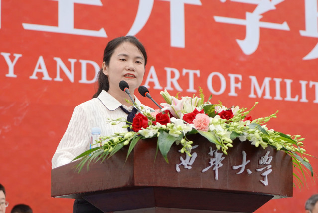 理学院教师王玉兰作为教师代表致辞,分享了对人生的体会与感悟,勉励同学们调整好心态、学会学习;保持乐观,学会坚持;开阔眼界、提升格局,度过充实而不留遗憾的大学生活。她希望同学们从今天开始,一步一个脚印,坚实地走好人生马拉松的西华这一程,逐渐成长为无愧于国家、无愧于社会、无愧于时代的建设者和接班人。