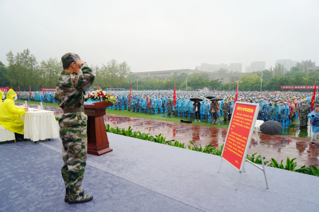参训学生代表、管理学院刘坤鹏带领全体参训学生宣读军训誓词,作出如下承诺:以军人的标准严格要求自己,努力学习,刻苦训练,服从命令,遵守纪律,听从指挥,艰苦奋斗,团结互助,诚实守信,争做优秀学员,以优异的成绩向学校领导和全校师生汇报。响彻云霄的宣誓声尽显同学们刻苦训练,听党指挥,奉献青春的决心。