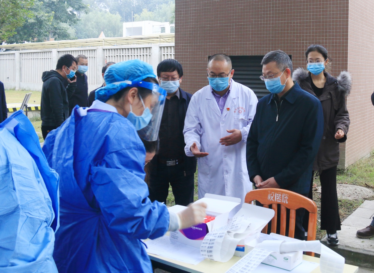 学校领导在校医院核酸监测点检查疫情防控工作