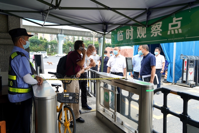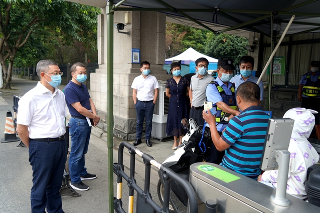 面对成都市疫情防控形势严峻复杂、学校实行居家办公和线上教学的情况,9月1日上午,校党委书记、疫情防控工作领导小组组长余孝其带队深入南大门、西大门、西侧门、西华苑北苑东门等值班值守岗、校园管控、一食堂核酸检测点等地,实地检查督导疫情防控措施落实情况和生活条件保障、情绪稳控等情况,慰问值守校园疫情防控工作一线的防疫工作人员,并就抓实抓细防控措施和关心关爱师生员工提出了工作要求。校党委副书记、校纪委书记朱燕萍,校党委副书记张力,副校长费凌、郑鈜,学校疫情防控工作领导小组办公室相关人员陪同检查。
